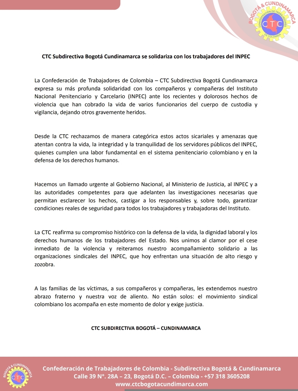 COMUNICADO DE LA CTC SUBDIRECTIVA BOGOTÁ – CUNDINAMARCA ANTE LOS HECHOS DE AGRESIÓN CONTRA EL PUEBLO PALESTINO Y LA SOBERANÍA COLOMBIANA